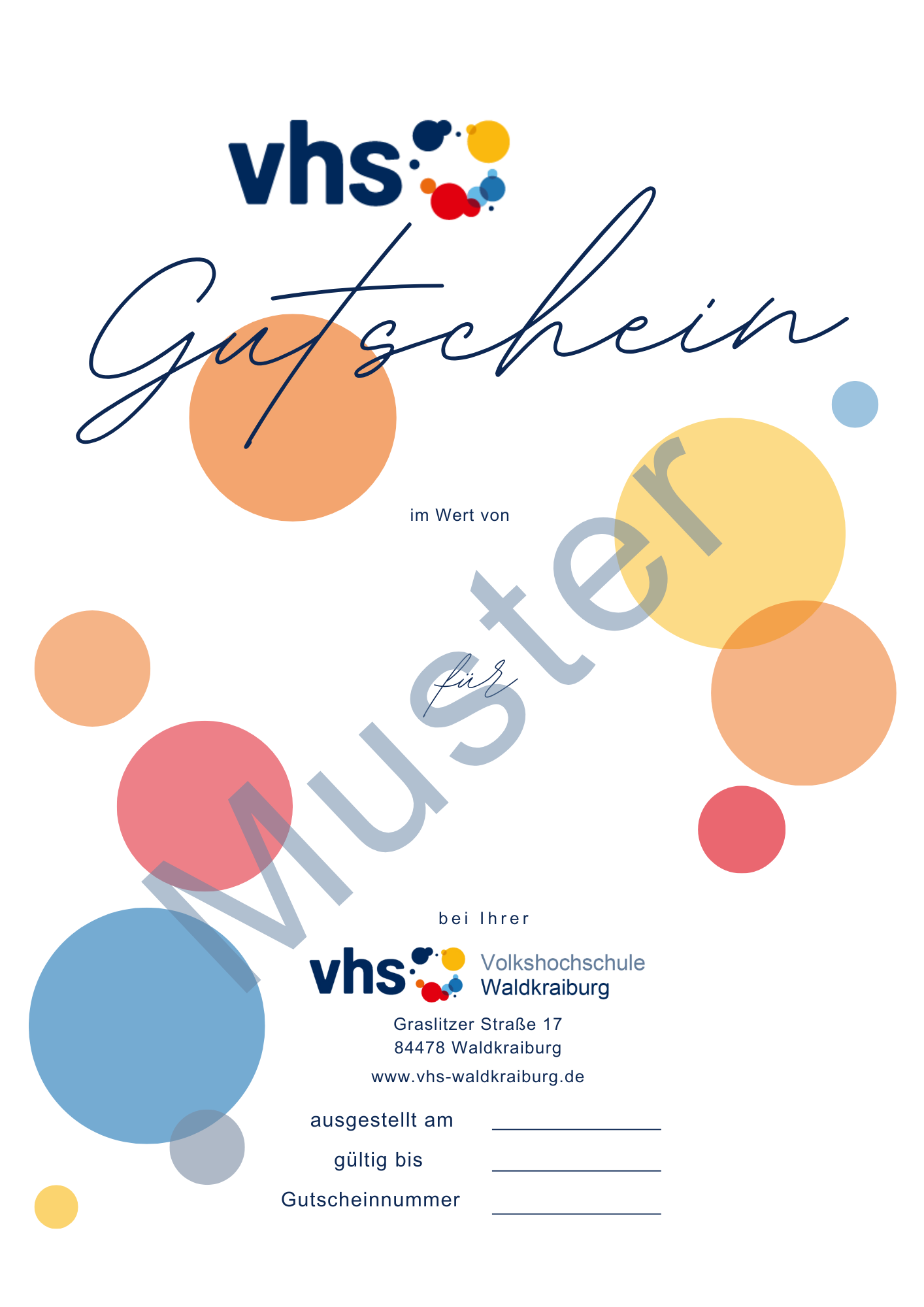 Einen Geschenkgutschein der vhs Waldkraiburg gibt's entweder in der Geschäftsstelle der vhs Waldkraiburg oder - jetzt neu! - direkt über den folgenden Link: